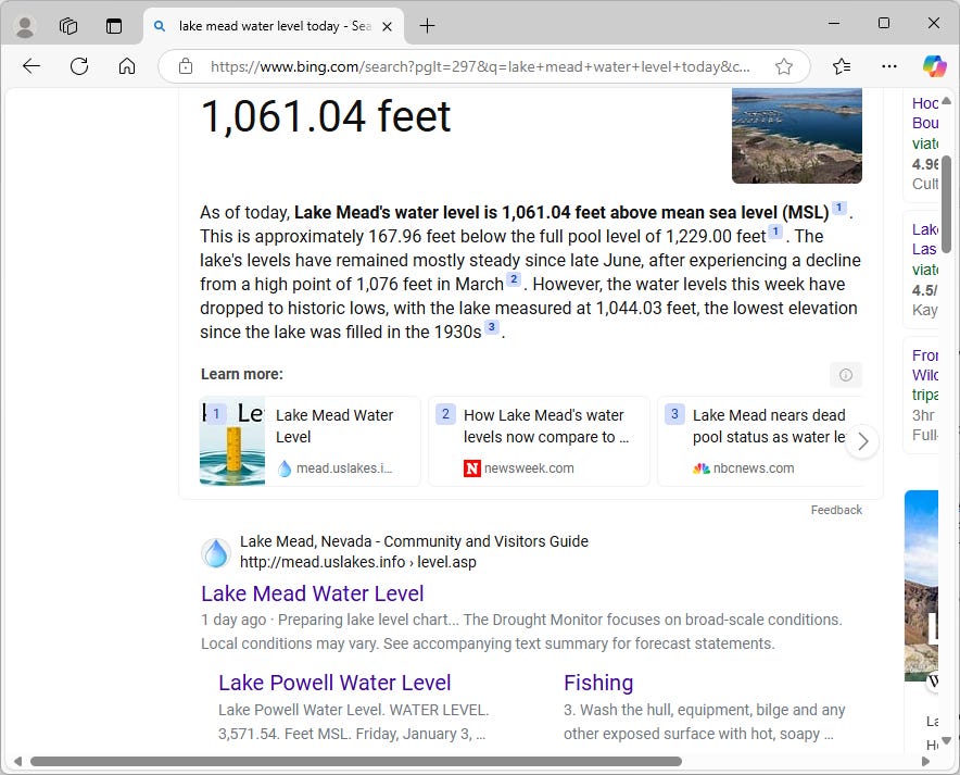 I used Bing today and searched on Lake Mead Water Level Today. I used the snipping tool to record the result. What would you think? I have been seeing the same result for months. Notice the last line under Lake Powell Water Level says Friday, January 3. I was trying to get some proof that it was a current result. If you didn’t know any better, would you believe Lake Mead is at 1061.04 feet? Or would you believe the line that says, “However, the water levels this week have dropped to historic lows, with the lake measured at 1,044.03 feet, the lowest elevation since the lake was filled in the late 1930s.” When I clicked on the “3” superscript, I was taken to an article written June 22, 2022. I was served a response based on an article that was two and a half years old.