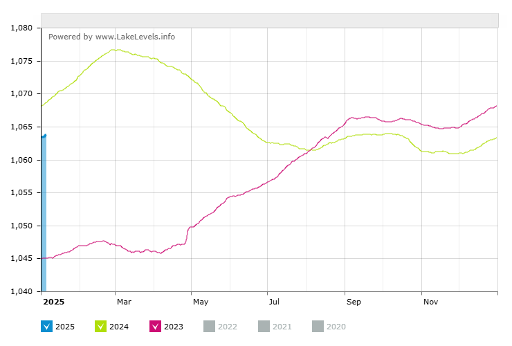 However, we did see improvement. Because of my interest, I began checking the level regularly. Here is a graph generated today. Notice the lake is more than 18 feet above its level in 2023 and about 5 feet below the level last year.